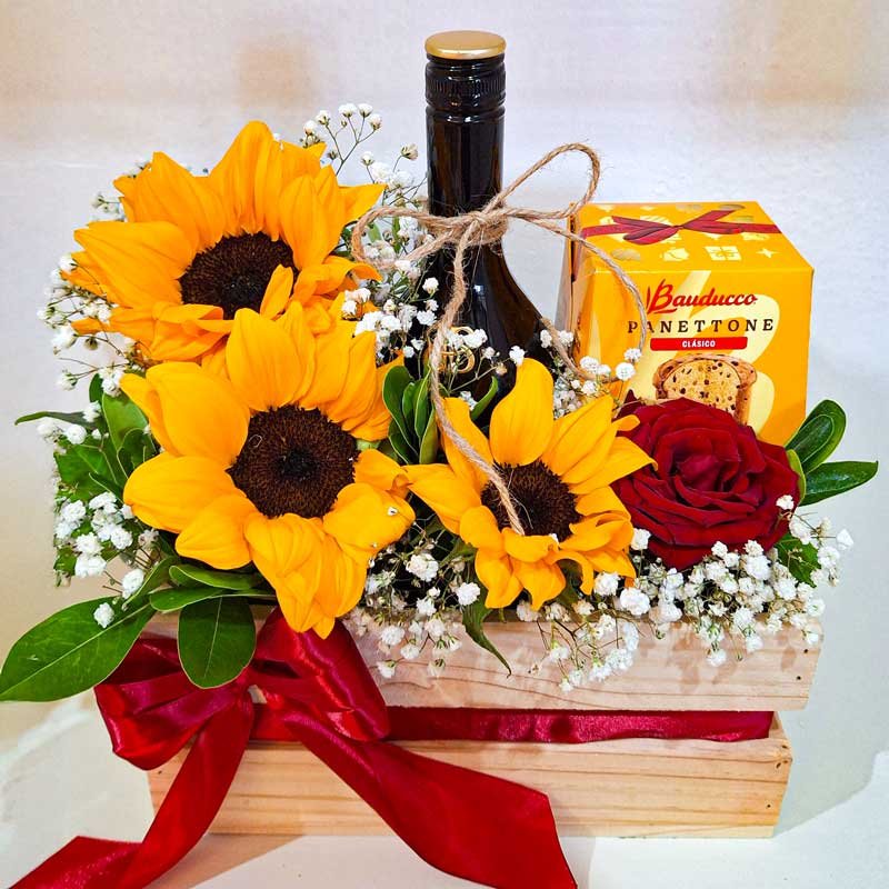 Hermoso arreglo en caja de pino, decorada con tres girasoles y una rosa roja con follaje y gypsophilia.