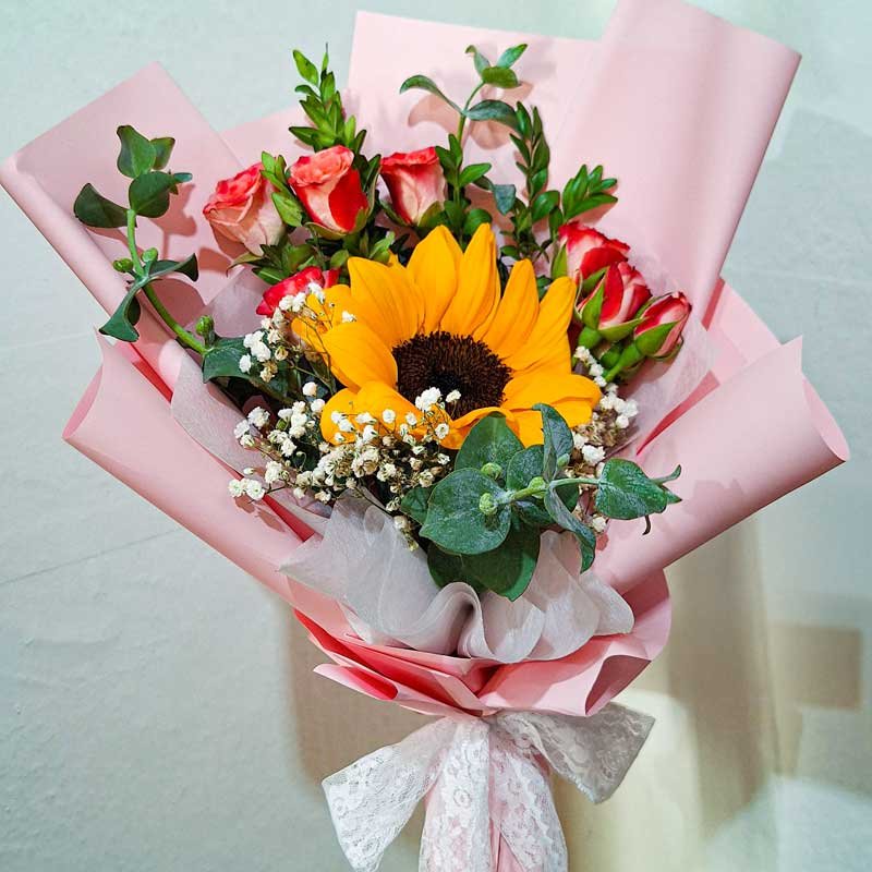 Hermoso ramo compuesto por la belleza de un Girasol con 6 delicadas Mini Rosas en tono rosados, complementado con follaje (Gypsopgila – Eucaliptus).